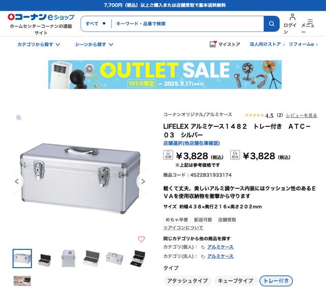 「ホームセンタのアルミケースが安くていい!」という情報をネットで見て調査したら、コーナンオリジナルで適当なサイズのケースを見つけた。