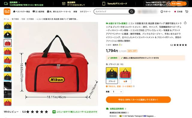 最終候補は偽Nikonロゴ付きのバッグ、「カメラ用にも適している」的な紹介で寸法も大丈夫そう。