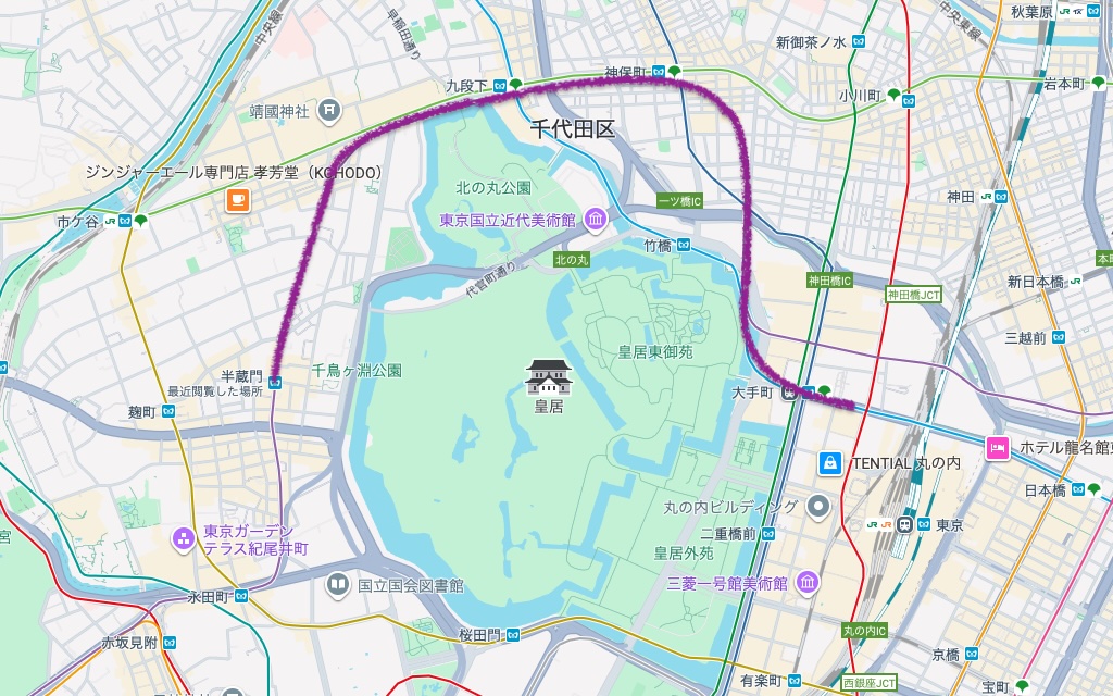 皇居を避けて時計回りに半周し、更に90°向きが変わっています。気付かぬうちに進行方向が変化してしまうのが、地下鉄に乗ると迷子になる原因の一つ。