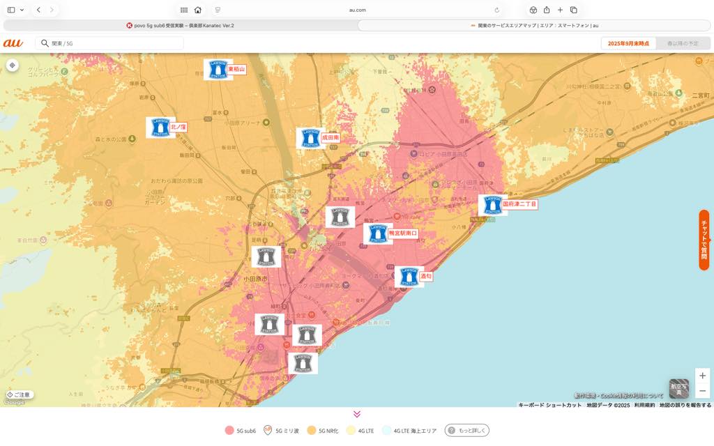 詳細に見ると南町付近に5G Sub6エリアの狭間のような微妙な場所もあるが、風祭まで5G Sub6エリアが広がった。